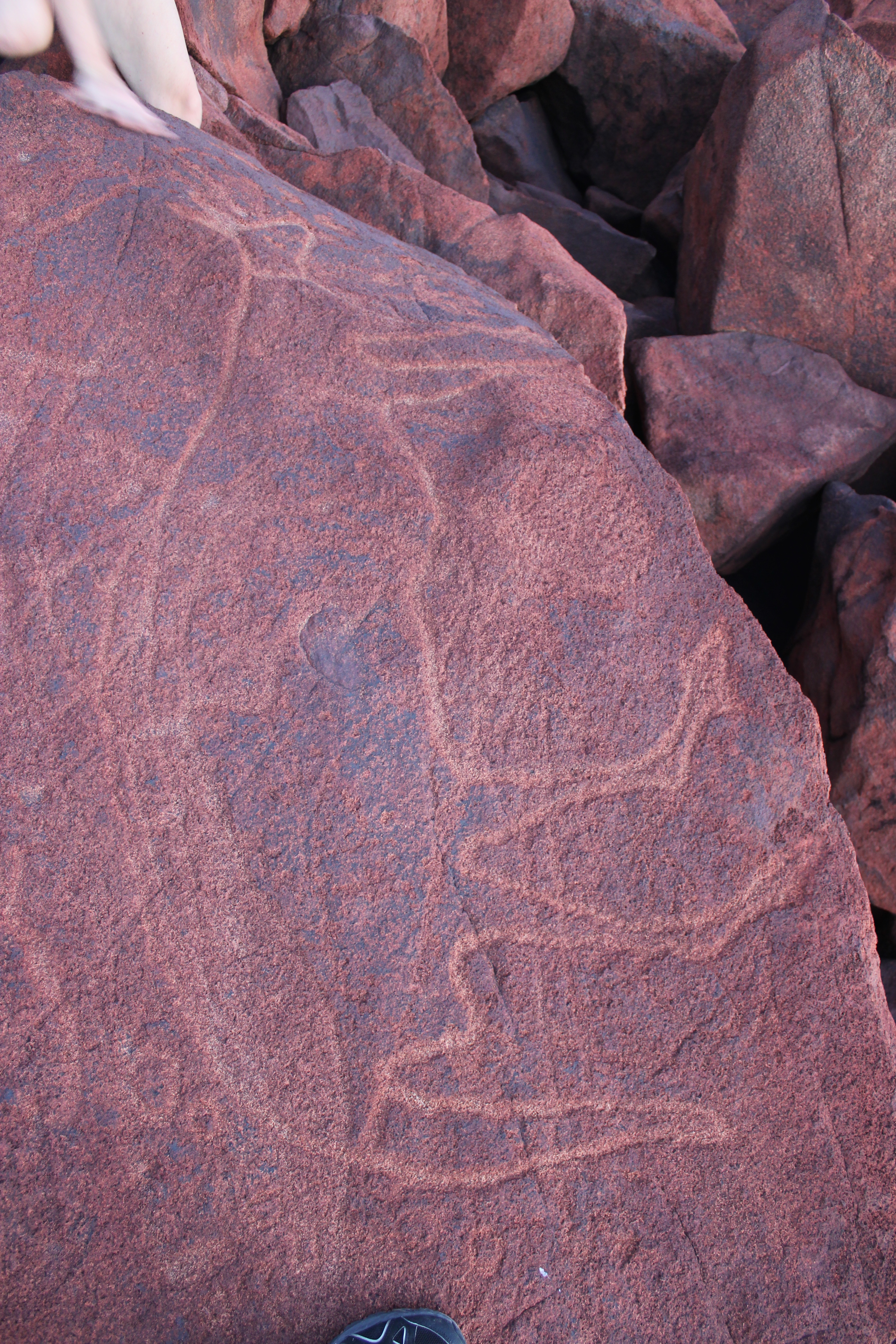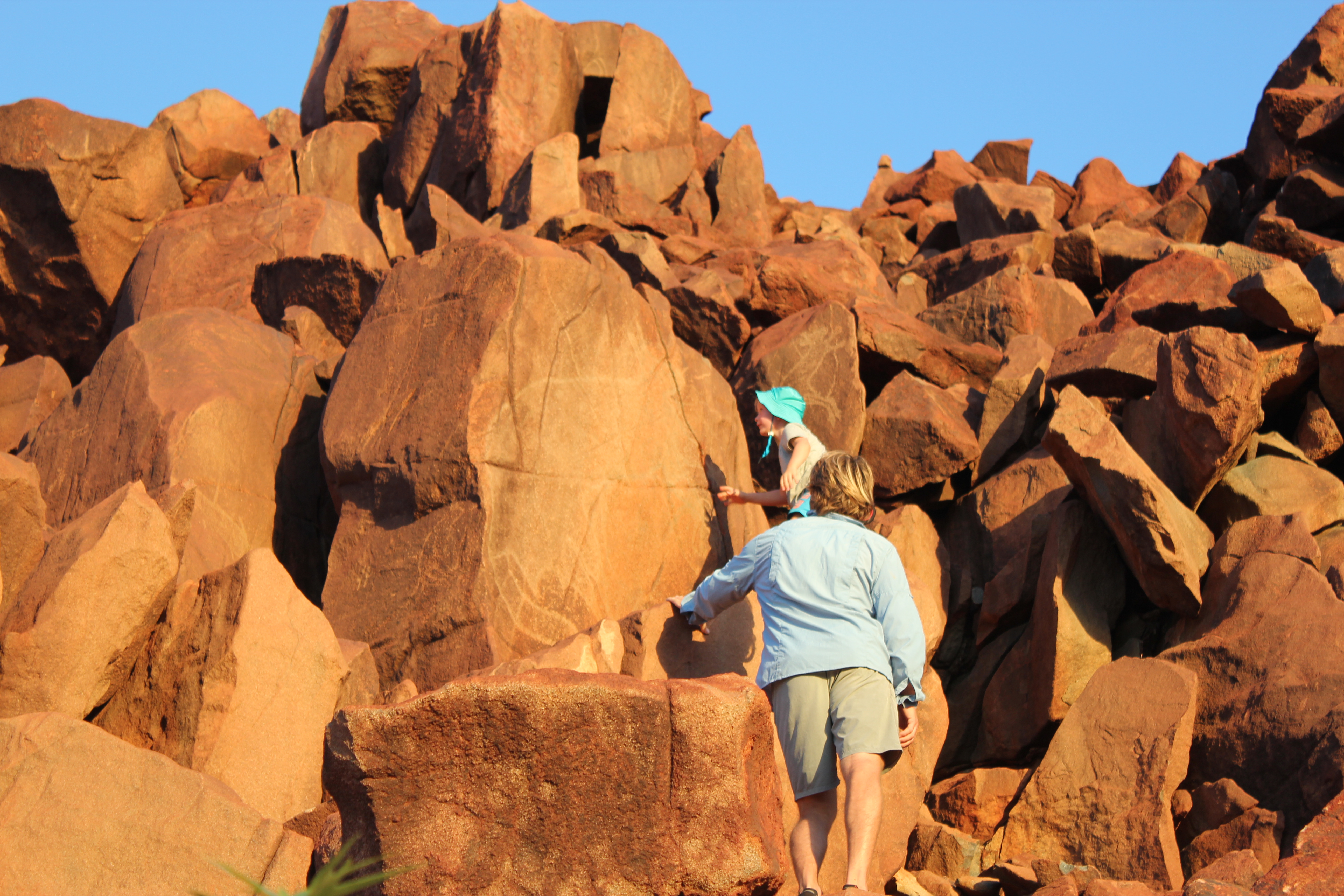 The forecast showed lighter conditions between Dampier and Broome coming up. Almost too light really, but we were not keen to battle 25-30kn SE along 80mile beach as we know the BoM always warns you can expect gust 40% stronger. So on the 17th of July, we upped anchor from Hampton Harbour and sailed over the five shipping channels to different loading facilities across Dampier Port. We timed the tide correctly for Flying Foam Passage, a gap through the Burrup Peninsula, and were able to sail into a bay on the eastern side of Dolphin Island and anchor out of the SE. Found a very suitable beach for landing and exploring and then had one of those “magic eye” moments when looking at the red rocks on the hill. The rock art on the Burrup is prolific and it is sad to think of how much has been lost to “progress”. There is still a lot to see though so get up here one day.