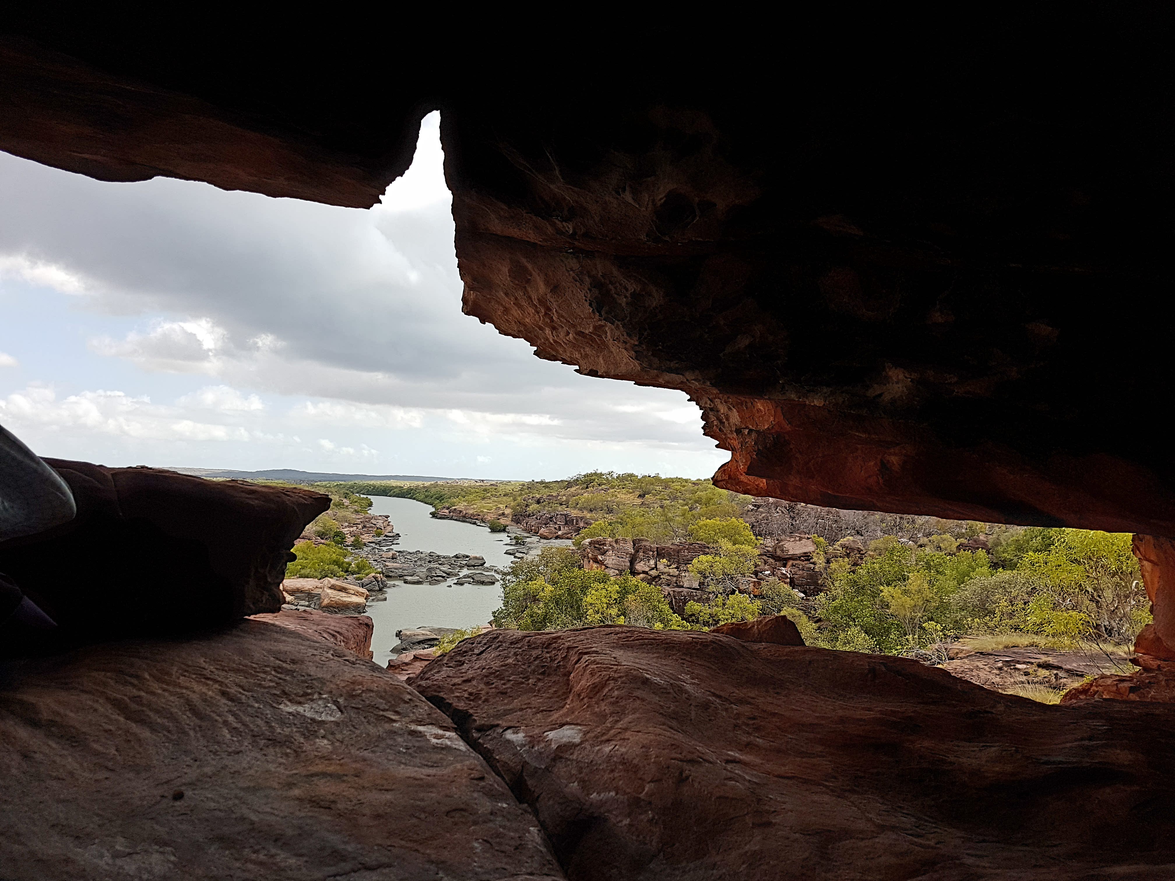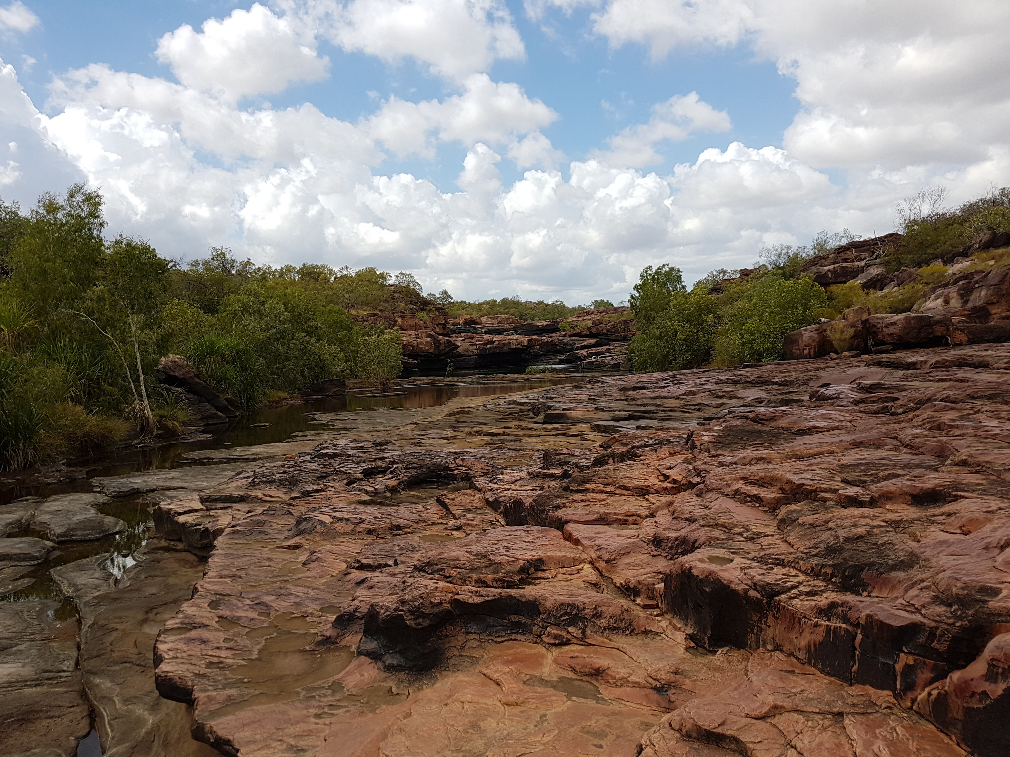 The next morning with the incoming tide, we took Gonyonda down to the sandy hole at the entrance to Surveyors Creek and anchored up before taking the dinghy up the creek. Was lucky to get the lure I had lost the previous evening back before hiking up the water smoothed boulders and dry falls to the pools on the plateau. We hiked a long way for little ones but they did a fantastic job. Once again, another amazingly scenic spot with eagles soaring on the thermals and Brolgas chatting in the shallow pools. Starting to notice some “build-up” type of clouds forming, which feels early for 29 of August.
